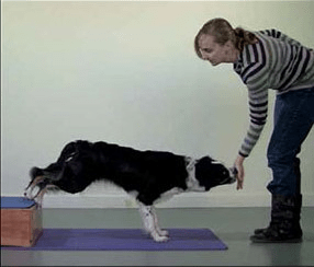 Попросите собаку стать задними лапами на коробку высотой по локоть. Собака может сделать это шагнув вперёд так, чтобы передние лапы оказались на полу, а задние на коробке. Или попросите её шагнуть назад на коробку и затем поощрите. Пусть собака так постоит 15 секунд; повторите пять раз. Если собака очень нестабильна и/или неоднократно сходит с коробки, начните выполнять упражнения на мышцы кора второго уровня. Если собака нестабильна, но удерживает лапы на коробке 15 секунд, приступайте к упражнениям третьего уровня. Если собака может выполнить упражнение с хорошей устойчивостью в пяти подходах по 15 секунд, проведите тест уровня 4.