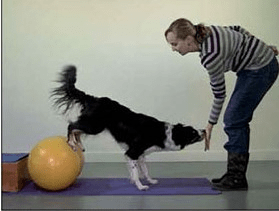 Попросите собаку стать задними лапами на балансировочный диск. Она может сделать это пройдя по диску, так чтобы передние лапы оказались на полу, а задние остались на снаряде. Или попросите собаку шагнуть назад на диск и поощрите после этого. Проверьте, может ли собака удержать положение в течение 15 секунд; повторите пять раз. Когда мозг получает сигнал, что тело способно удержать позицию, даже сложную, нервы сигнализируют мышцам оставаться на диске. Это положение собака будет сохранять, пока мышцы не переутомятся, отчего она сойдёт со снаряда. Если собака стоит очень неуверенно и/или неоднократно сходит с диска, начните упражнения на мышцы-стабилизаторы с первого уровня. Если собака стоит неуверенно, но удерживает лапы на диске, начните со второго уровня. Если собака стоит уверенно и может выполнить упражнение в пяти повторениях, проделайте с ней тест уровня 3 (ниже). Продолжайте этот процесс до тех пор, пока не установите подходящий уровень интенсивности упражнений. Правильно подобранные упражнения стоит выполнять дважды в неделю в течение двенадцати недель. Упражнения и их количество за одно занятие см. ниже в этой главе.